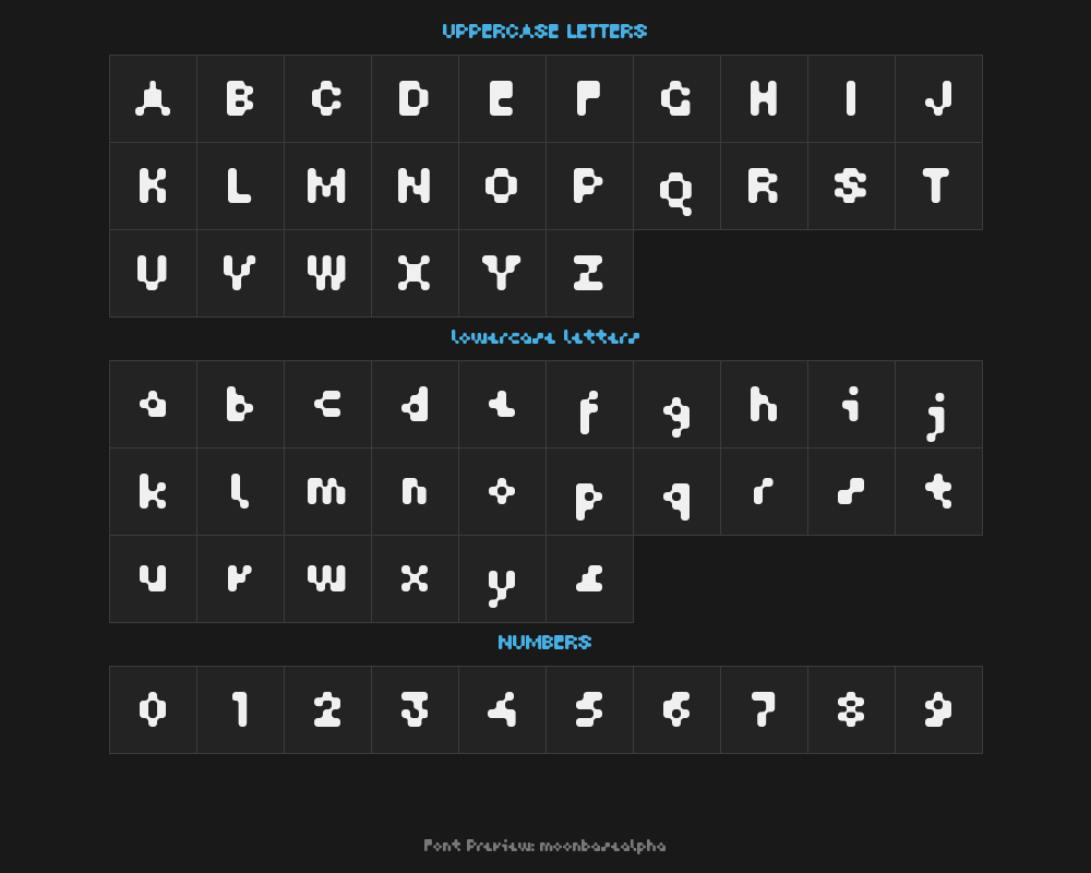 moonbasealpha is a font file with a size of 0.06 MB. The full font name is MoonbaseAlpha, Altsys Fontographer 4.0 2 3 96 version. It contains 219 characters, supports 8 Chinese characters. The copyright belongs to MoonbaseAlpha. moonbasealpha font is available for free download, but commercial use requires confirmation on the MoonbaseAlpha official website whether it's free for commercial use.