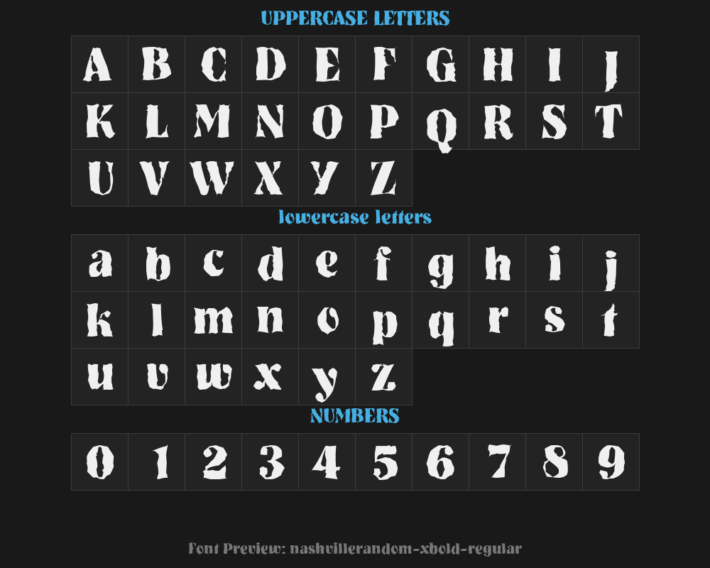 nashvillerandom-xbold-regular is a font file with a size of 0.08 MB. The full font name is NashvilleRandom-Xbold-Regular, Version 1.0 28-08-2002 version. It contains 229 characters, supports 8 Chinese characters. The copyright belongs to NashvilleRandom-Xbold. nashvillerandom-xbold-regular font is available for free download, but commercial use requires confirmation on the NashvilleRandom-Xbold official website whether it's free for commercial use.