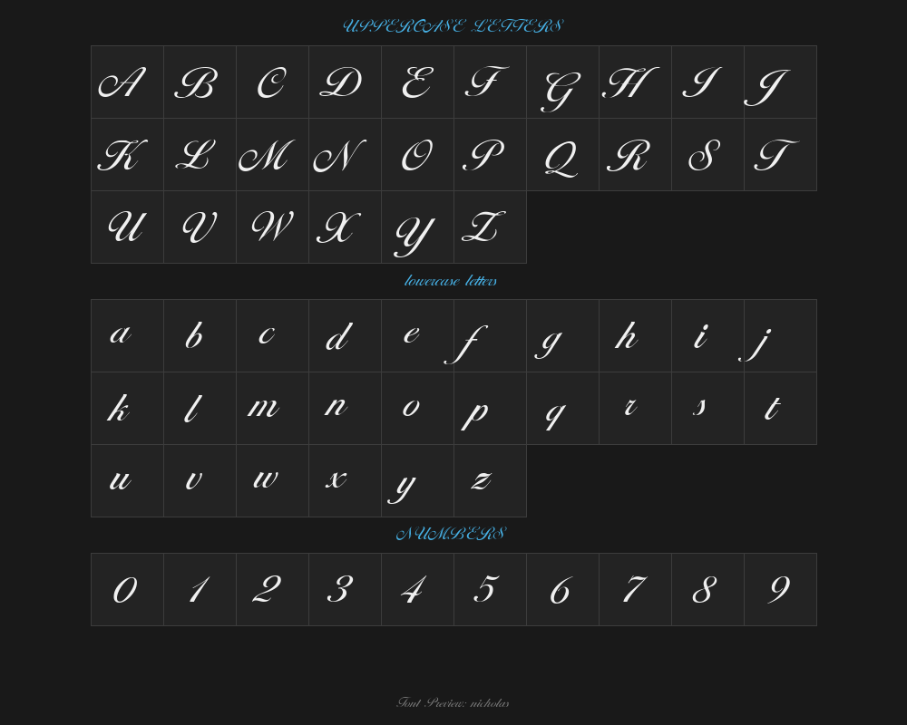 nicholas is a font file with a size of 0.05 MB. The full font name is Nicholas, 001.000 version. It contains 235 characters, supports 8 Chinese characters. The copyright belongs to Nicholas. nicholas font is available for free download, but commercial use requires confirmation on the Nicholas official website whether it's free for commercial use.