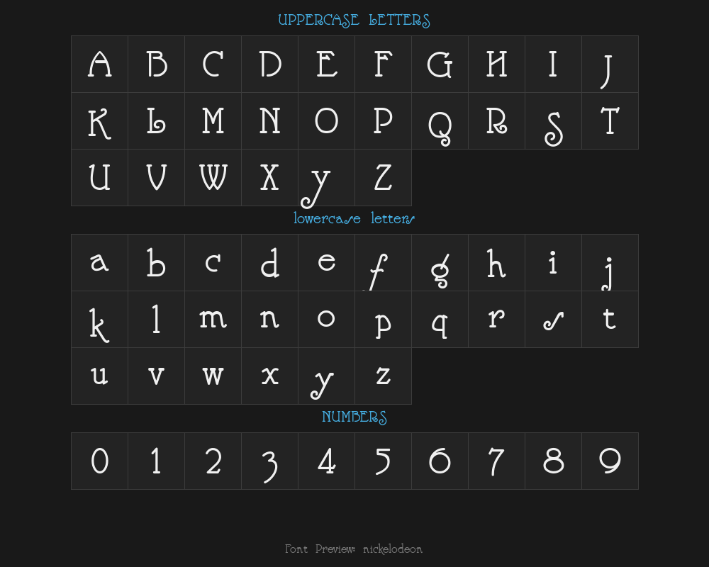 nickelodeon is a font file with a size of 0.08 MB. The full font name is Nickelodeon, Converted from e nickfo~1 NI______.TF1 by ALLTYPE version. It contains 394 characters, supports 8 Chinese characters. The copyright belongs to Nickelodeon. nickelodeon font is available for free download, but commercial use requires confirmation on the Nickelodeon official website whether it's free for commercial use.
