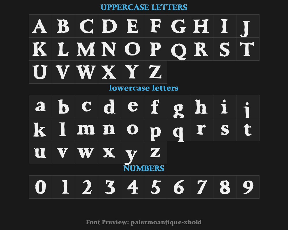 palermoantique-xbold is a font file with a size of 0.08 MB. The full font name is PalermoAntique-Xbold-Regular, Version 1.0 28-08-2002 version. It contains 228 characters, supports 8 Chinese characters. The copyright belongs to PalermoAntique-Xbold. palermoantique-xbold font is available for free download, but commercial use requires confirmation on the PalermoAntique-Xbold official website whether it's free for commercial use.