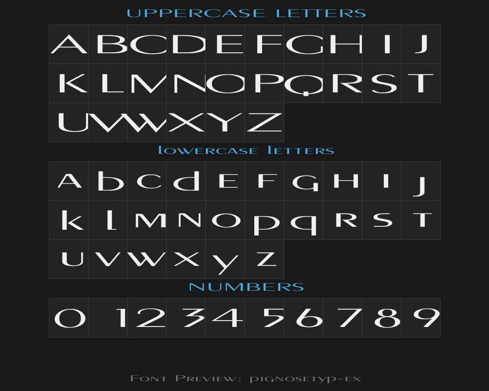 pignosetyp-ex is a font file with a size of 0.05 MB. The full font name is PigNoseTyp Ex, 1.0 version. It contains 394 characters, supports 8 Chinese characters. The copyright belongs to PigNoseTyp Ex. pignosetyp-ex font is available for free download, but commercial use requires confirmation on the PigNoseTyp Ex official website whether it's free for commercial use.