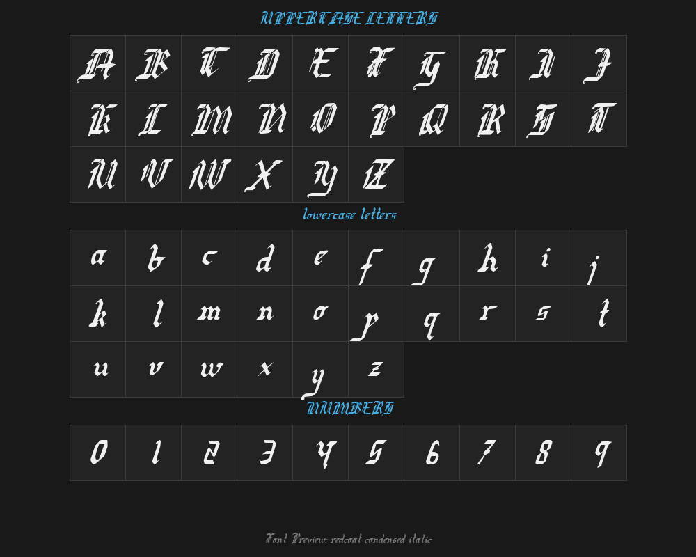 | AboutFont | Redcoat Condensed Italic 2008 |