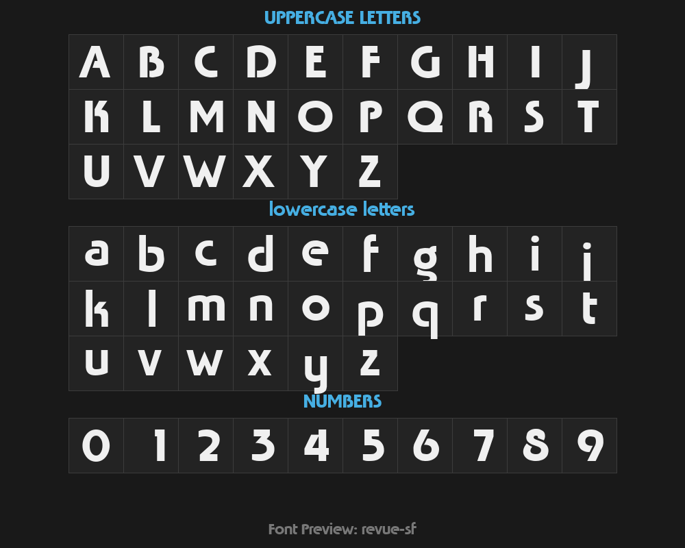 revue-sf is a font file with a size of 0.04 MB. The full font name is Revue SF, Altsys Fontographer 3.5 4 29 93 version. It contains 183 characters, supports 8 Chinese characters. The copyright belongs to Revue SF. revue-sf font is available for free download, but commercial use requires confirmation on the Revue SF official website whether it's free for commercial use.