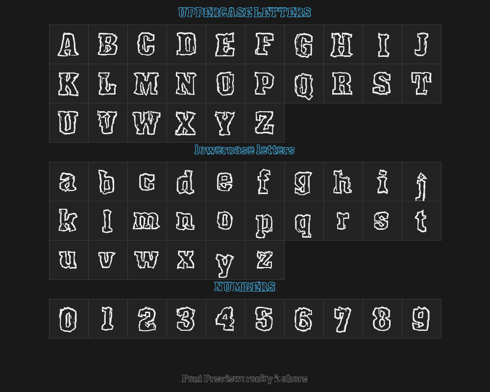 rocky-shore is a font file with a size of 0.23 MB. The full font name is Rocky Shore, Version 1.000 - DEMO version. It contains 96 characters, supports 8 Chinese characters. The copyright belongs to Rocky Shore. rocky-shore font is available for free download, but commercial use requires confirmation on the Rocky Shore official website whether it's free for commercial use.