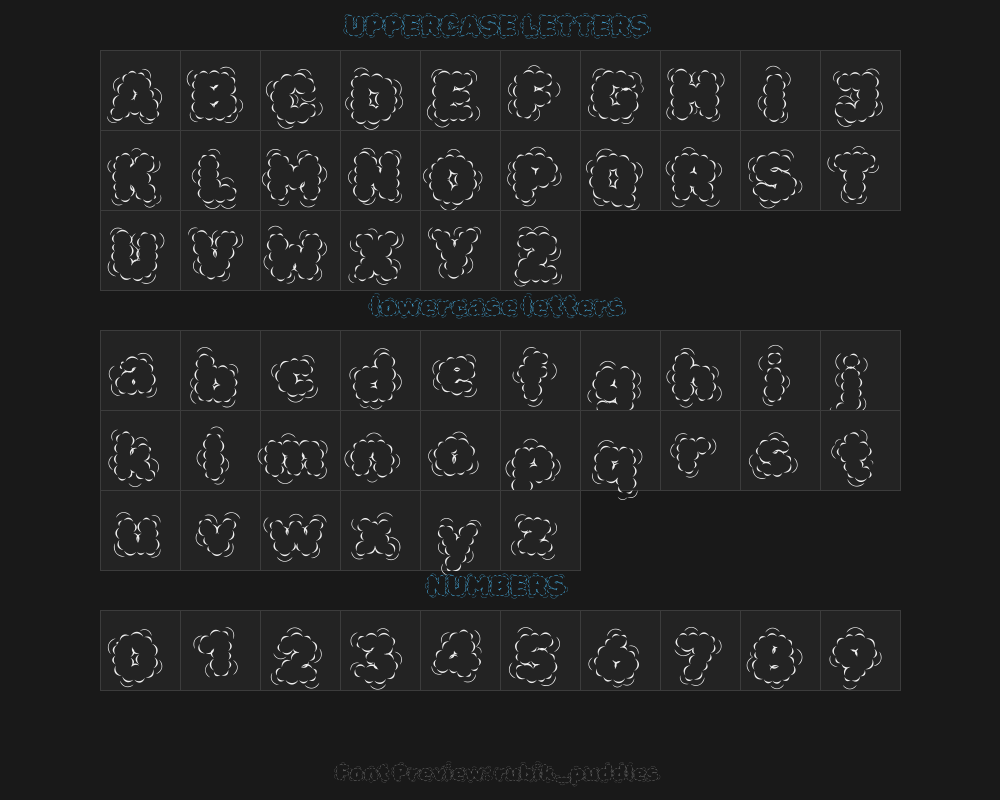 rubik_puddles is a font file with a size of 0.39 MB. The full font name is Rubik Puddles Regular, Version 2.200 version. It contains 689 characters, supports 8 Chinese characters. The copyright belongs to Rubik Puddles. rubik_puddles font is available for free download, but commercial use requires confirmation on the Rubik Puddles official website whether it's free for commercial use.