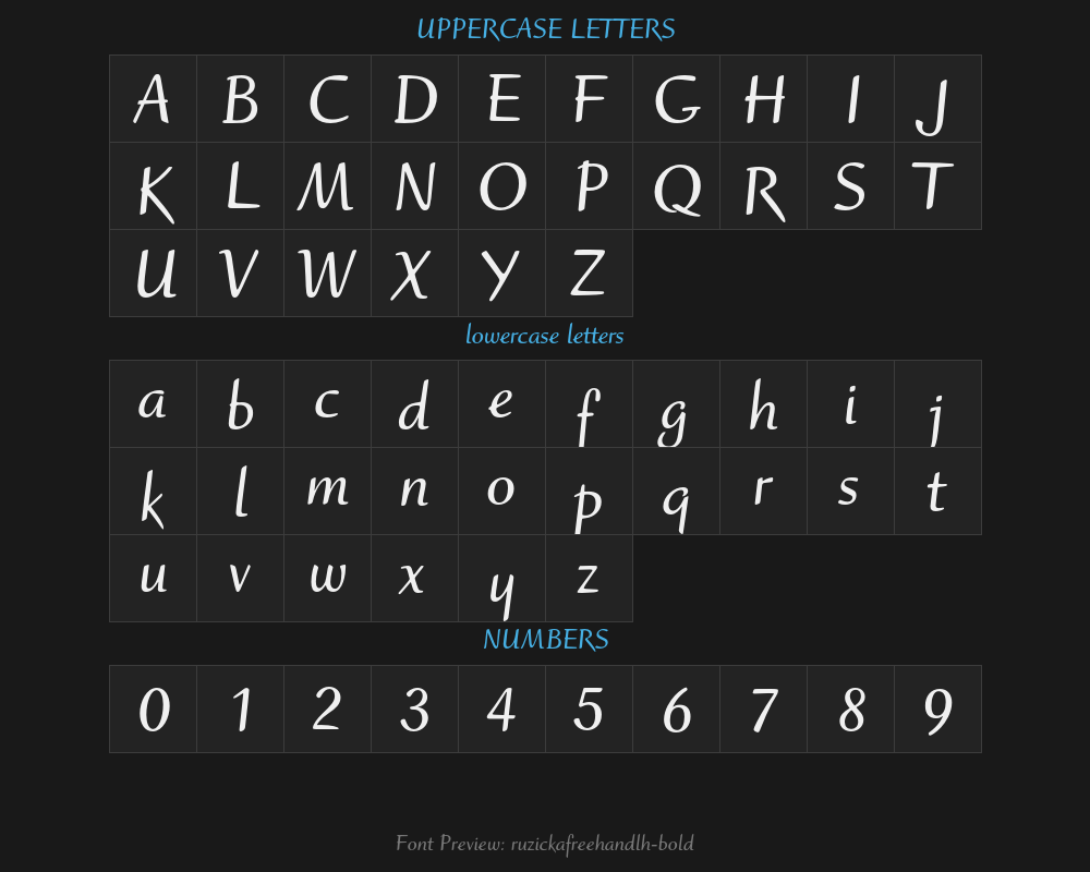 ruzickafreehandlh-bold is a font file with a size of 0.04 MB. The full font name is RuzickaFreehandLH-Bold, 001.001 version. It contains 228 characters, supports 8 Chinese characters. The copyright belongs to Ruzicka Freehand LH. ruzickafreehandlh-bold font is available for free download, but commercial use requires confirmation on the Ruzicka Freehand LH official website whether it's free for commercial use.