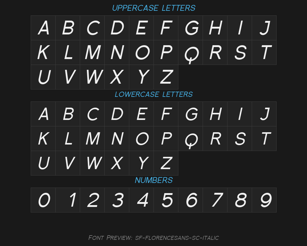 sf-florencesans-sc-italic is a font file with a size of 0.05 MB. The full font name is SF Florencesans SC Italic, Version 1.1 version. It contains 223 characters, supports 8 Chinese characters. The copyright belongs to SF Florencesans SC. sf-florencesans-sc-italic font is available for free download, but commercial use requires confirmation on the SF Florencesans SC official website whether it's free for commercial use.