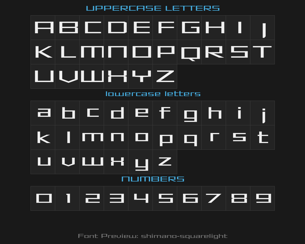 shimano-squarelight is a font file with a size of 0.02 MB. The full font name is Shimano-SquareLight, 001.000 version. It contains 244 characters, supports 8 Chinese characters. The copyright belongs to Shimano SquareLight. shimano-squarelight font is available for free download, but commercial use requires confirmation on the Shimano SquareLight official website whether it's free for commercial use.