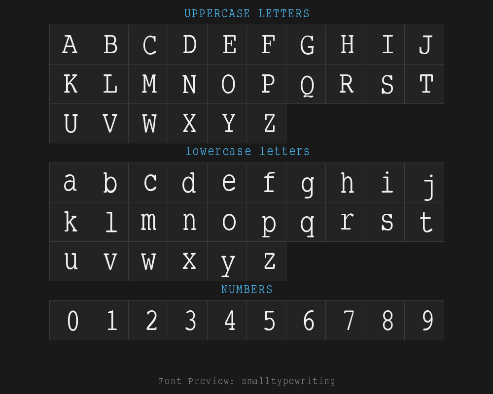 smalltypewriting is a font file with a size of 0.08 MB. The full font name is SmallTypeWriting, 1.0 2006-04-06 version. It contains 392 characters, supports 8 Chinese characters. The copyright belongs to SmallTypeWriting. smalltypewriting font is available for free download, but commercial use requires confirmation on the SmallTypeWriting official website whether it's free for commercial use.
