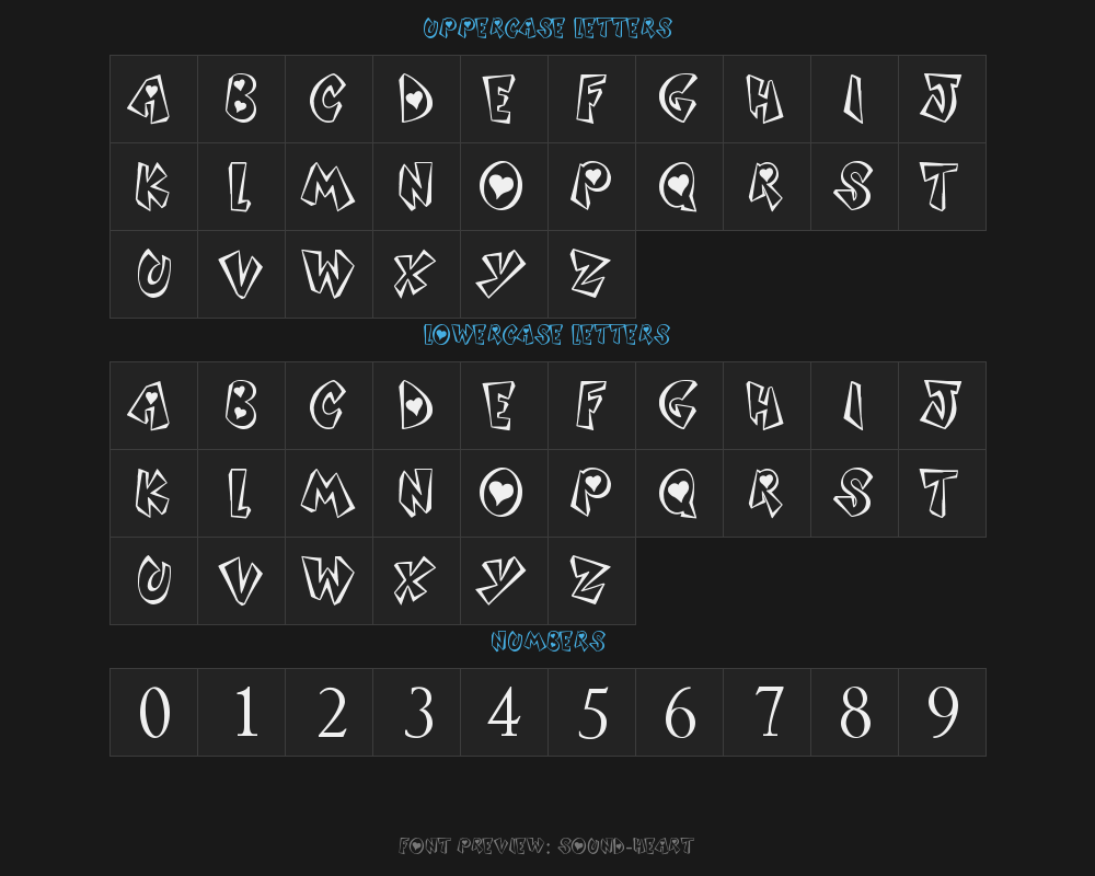 sound-heart is a font file with a size of 0.03 MB. The full font name is Sound Heart, Version 1.00 April 17, 2013, initial release version. It contains 240 characters, supports 8 Chinese characters. The copyright belongs to Sound Heart. sound-heart font is available for free download, but commercial use requires confirmation on the Sound Heart official website whether it's free for commercial use.