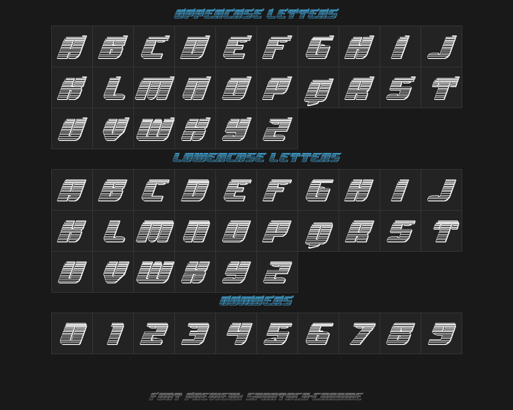 spartaco-chrome is a font file with a size of 0.15 MB. The full font name is Spartaco Chrome, Version 1.0; 2014 version. It contains 222 characters, supports 8 Chinese characters. The copyright belongs to Spartaco Chrome. spartaco-chrome font is available for free download, but commercial use requires confirmation on the Spartaco Chrome official website whether it's free for commercial use.
