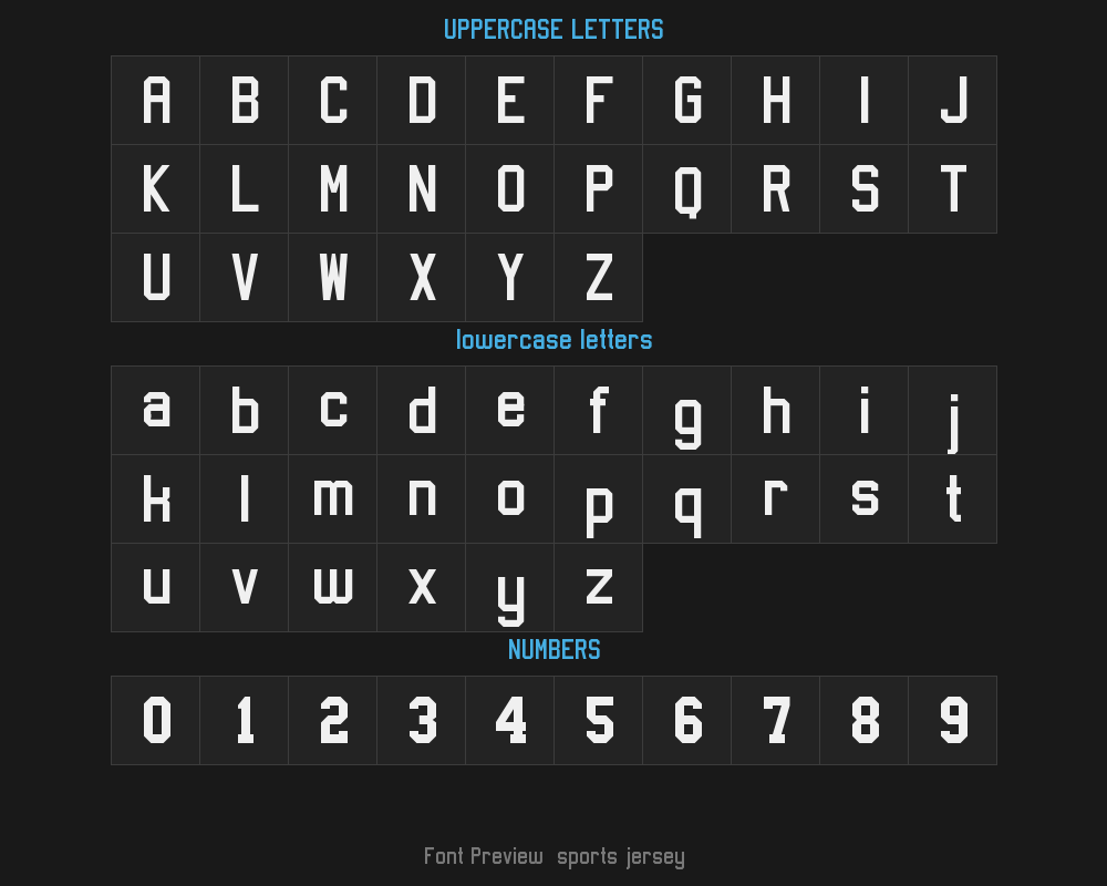 sports-jersey is a font file with a size of 0.02 MB. The full font name is Sports Jersey, Version 1.00 December 31, 2003 version. It contains 655 characters, supports 8 Chinese characters. The copyright belongs to Sports Jersey. sports-jersey font is available for free download, but commercial use requires confirmation on the Sports Jersey official website whether it's free for commercial use.