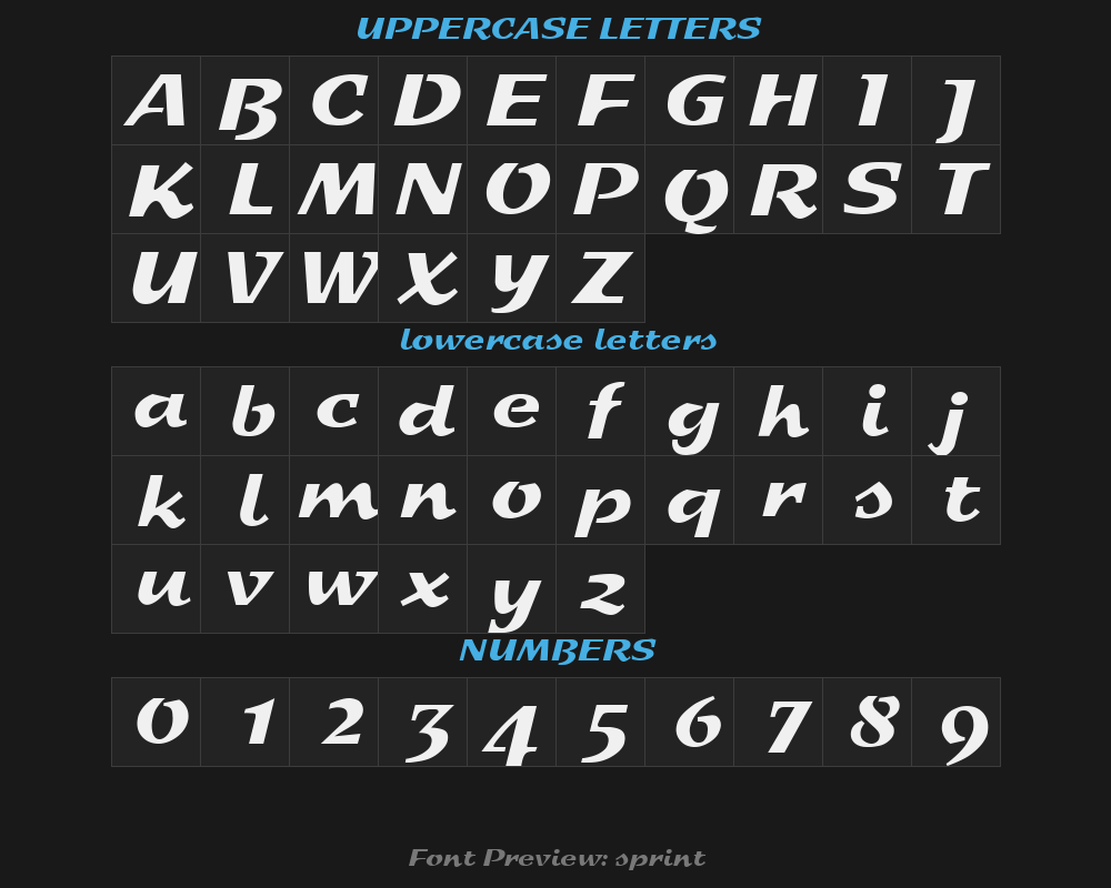 sprint is a font file with a size of 0.05 MB. The full font name is Sprint, B & P Graphics Ltd. 06.04.1993 version. It contains 207 characters, supports 8 Chinese characters. The copyright belongs to Sprint. sprint font is available for free download, but commercial use requires confirmation on the Sprint official website whether it's free for commercial use.