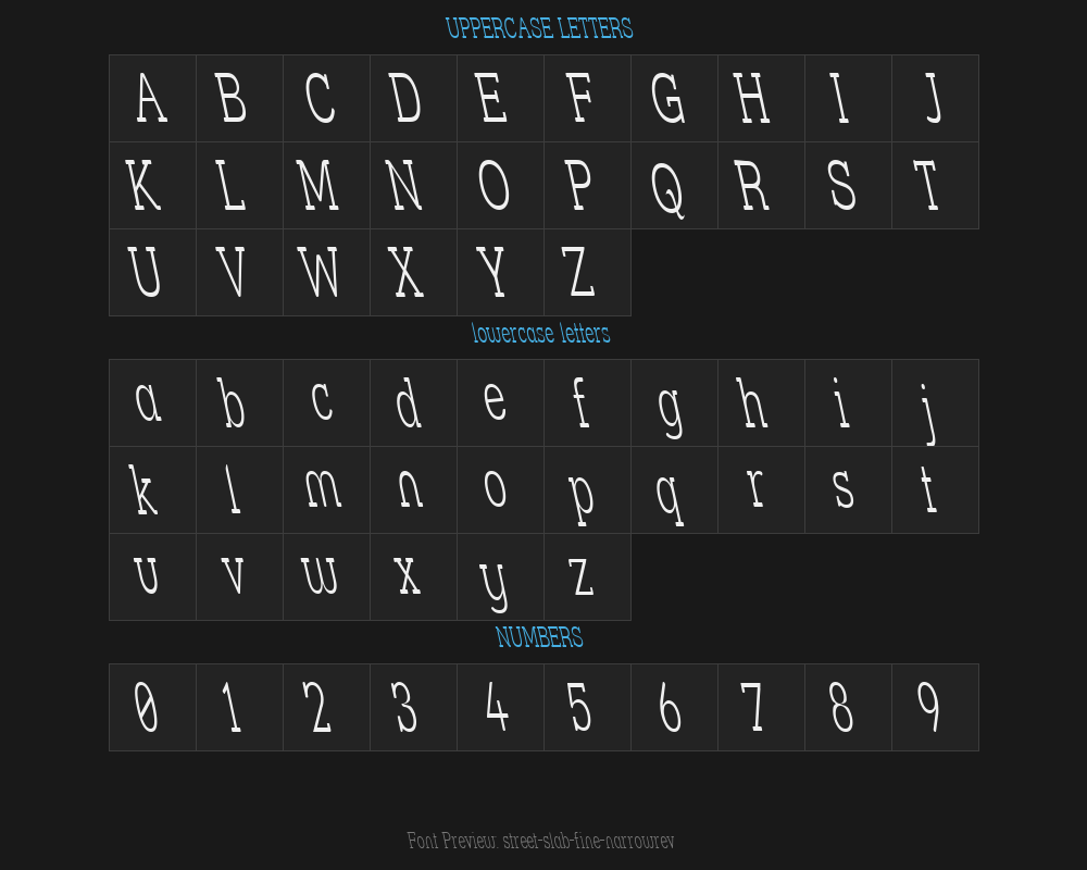 street-slab-fine-narrowrev is a font file with a size of 0.07 MB. The full font name is Street Slab Fine NarrowRev, 1.0 version. It contains 225 characters, supports 8 Chinese characters. The copyright belongs to Street Slab Fine NarrowRev. street-slab-fine-narrowrev font is available for free download, but commercial use requires confirmation on the Street Slab Fine NarrowRev official website whether it's free for commercial use.