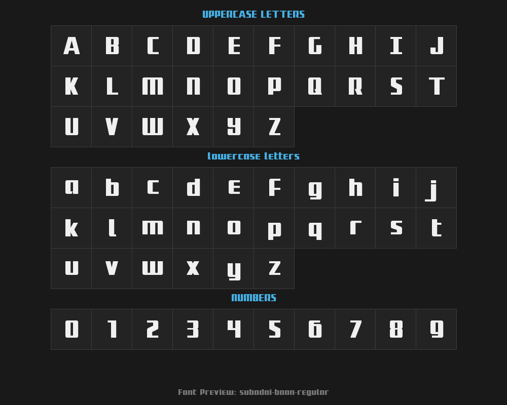 subadai-baan-regular is a font file with a size of 0.02 MB. The full font name is Subadai Baan Regular, Version 1.0; 2013 version. It contains 219 characters, supports 8 Chinese characters. The copyright belongs to Subadai Baan. subadai-baan-regular font is available for free download, but commercial use requires confirmation on the Subadai Baan official website whether it's free for commercial use.