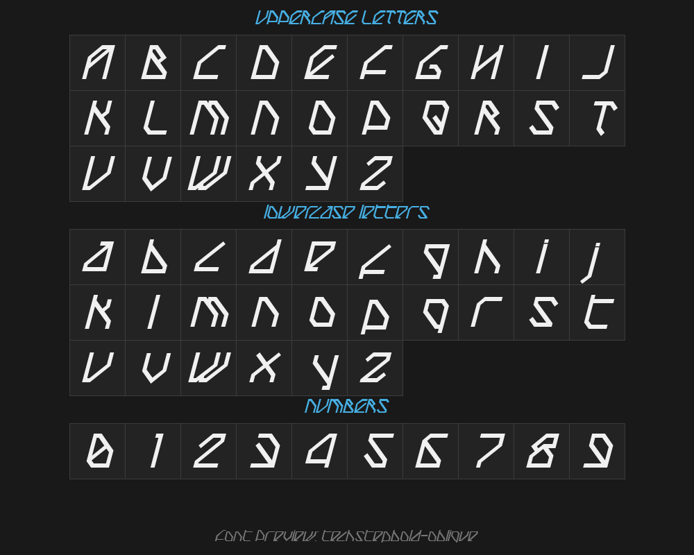 techstepbold-oblique is a font file with a size of 0.07 MB. The full font name is TechstepBold Oblique, Macromedia Fontographer 4.1.5 9 3 02 version. It contains 239 characters, supports 8 Chinese characters. The copyright belongs to TechstepBold Oblique. techstepbold-oblique font is available for free download, but commercial use requires confirmation on the TechstepBold Oblique official website whether it's free for commercial use.