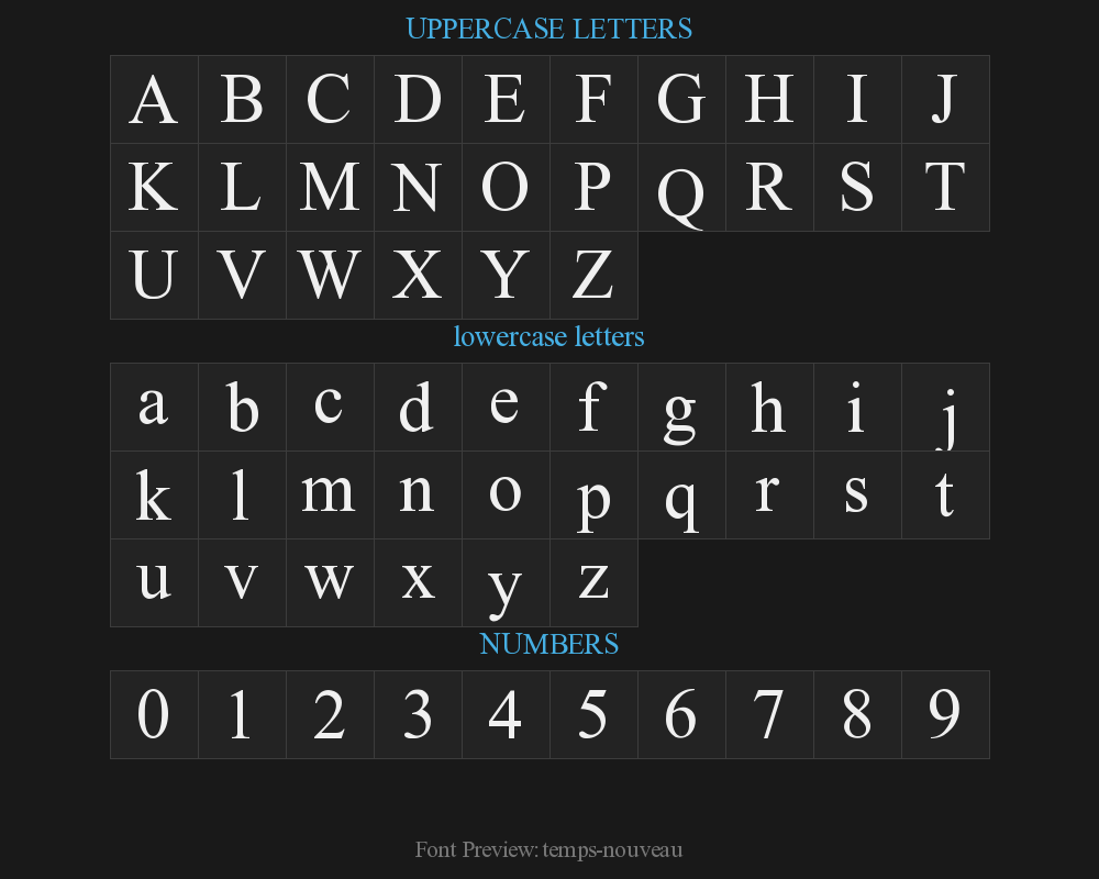 temps-nouveau is a font file with a size of 0.06 MB. The full font name is Temps Nouveau, 1.02 version. It contains 153 characters, supports 8 Chinese characters. The copyright belongs to Temps Nouveau. temps-nouveau font is available for free download, but commercial use requires confirmation on the Temps Nouveau official website whether it's free for commercial use.