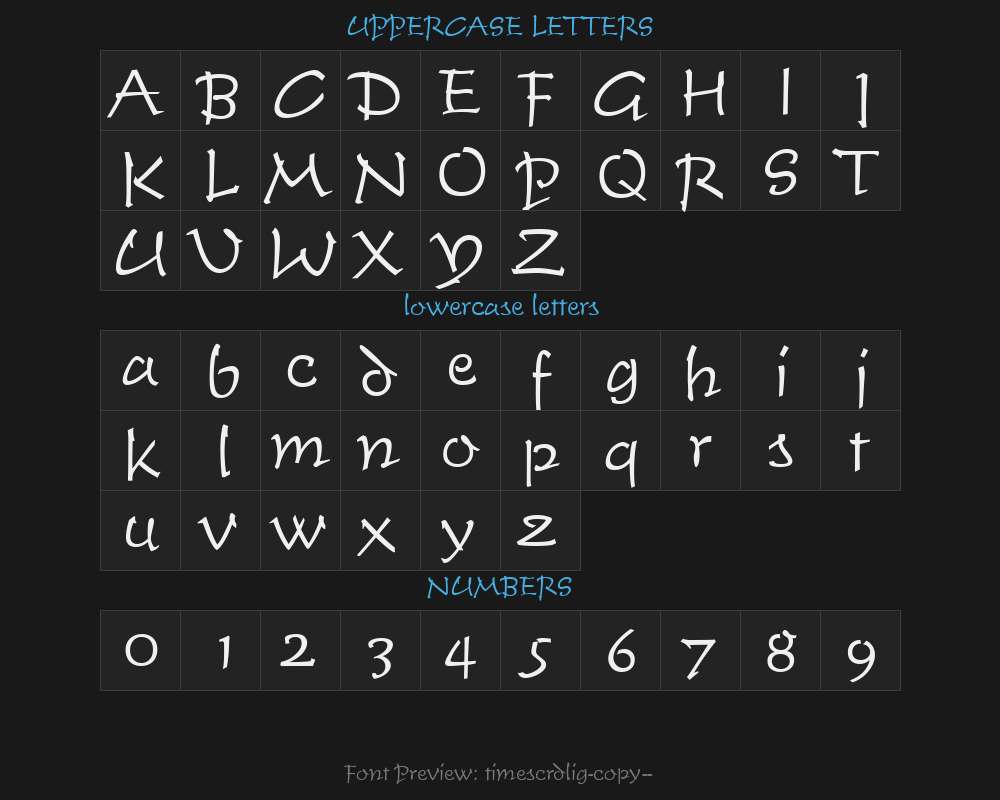 timescrdlig-copy-2- is a font file with a size of 0.11 MB. The full font name is TimeScrDLig, Version 001.005 version. It contains 523 characters, supports 8 Chinese characters. The copyright belongs to TimeScrDLig. timescrdlig-copy-2- font is available for free download, but commercial use requires confirmation on the TimeScrDLig official website whether it's free for commercial use.