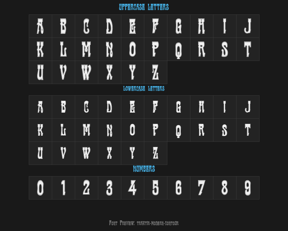 traktir-modern-contour is a font file with a size of 0.23 MB. The full font name is Traktir-Modern Contour, Version 1.000 2006 initial release version. It contains 287 characters, supports 8 Chinese characters. The copyright belongs to Traktir-Modern Contour. traktir-modern-contour font is available for free download, but commercial use requires confirmation on the Traktir-Modern Contour official website whether it's free for commercial use.