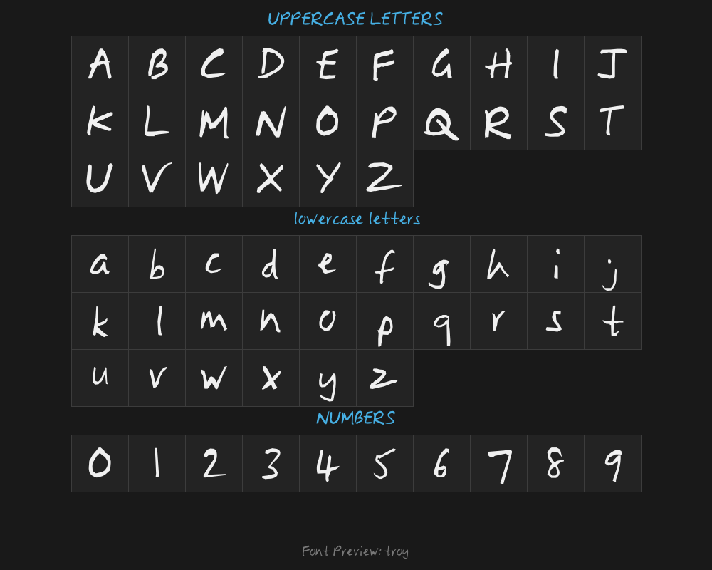 troy is a font file with a size of 0.05 MB. The full font name is Troy, 1.0 version. It contains 163 characters, supports 8 Chinese characters. The copyright belongs to Troy. troy font is available for free download, but commercial use requires confirmation on the Troy official website whether it's free for commercial use.