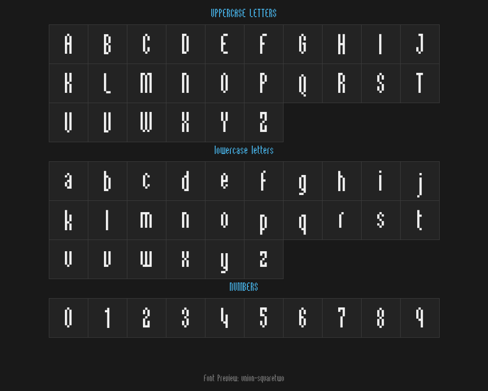 union-squaretwo is a font file with a size of 0.02 MB. The full font name is Union-SquareTwo, 001.000 version. It contains 211 characters, supports 8 Chinese characters. The copyright belongs to Union SquareTwo. union-squaretwo font is available for free download, but commercial use requires confirmation on the Union SquareTwo official website whether it's free for commercial use.