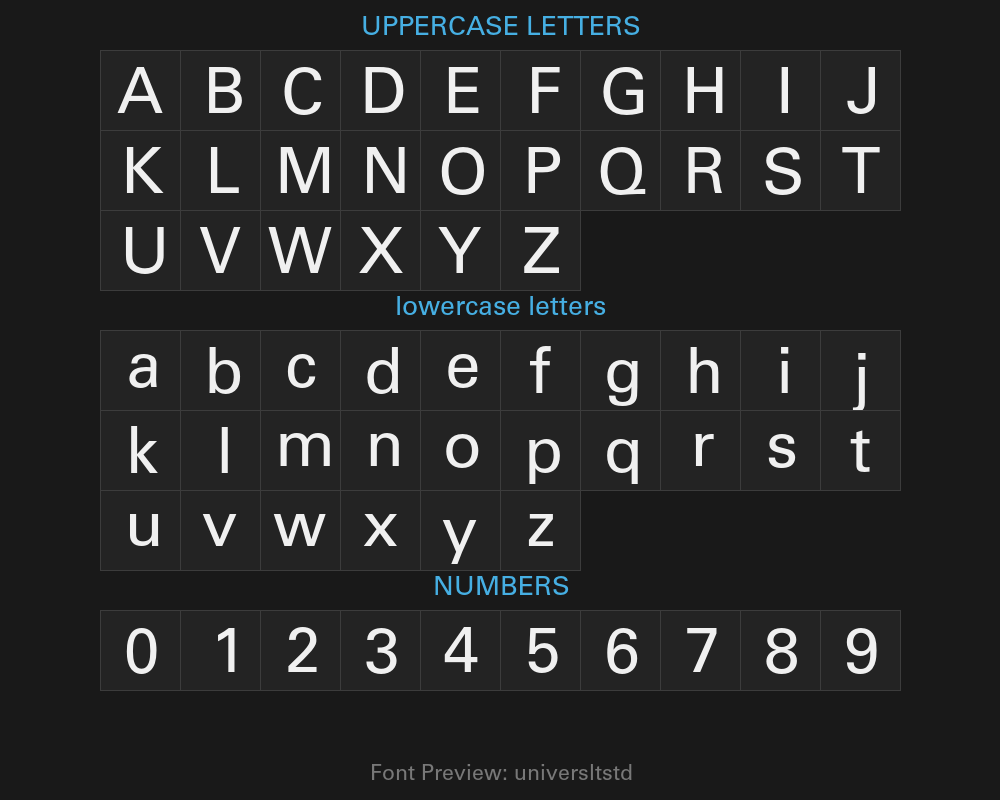 universltstd is a font file with a size of 0.03 MB. The full font name is UniversLTStd, OTF 1.029;PS 001.004;Core 1.0.33;makeotf.lib1.4.1585 version. It contains 252 characters, supports 8 Chinese characters. The copyright belongs to Univers LT Std 55. universltstd font is available for free download, but commercial use requires confirmation on the Univers LT Std 55 official website whether it's free for commercial use.