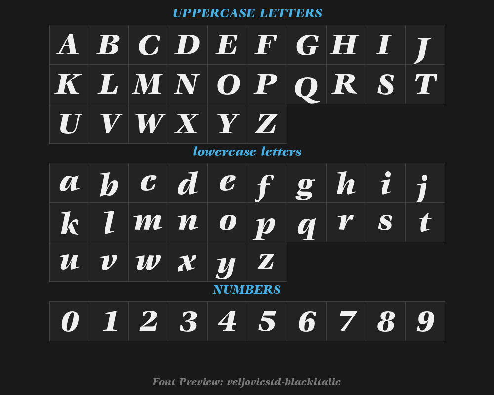 veljovicstd-blackitalic is a font file with a size of 0.03 MB. The full font name is VeljovicStd-BlackItalic, OTF 1.018;PS 001.001;Core 1.0.31;makeotf.lib1.4.1585 version. It contains 252 characters, supports 8 Chinese characters. The copyright belongs to ITC Veljovic Std Black. veljovicstd-blackitalic font is available for free download, but commercial use requires confirmation on the ITC Veljovic Std Black official website whether it's free for commercial use.