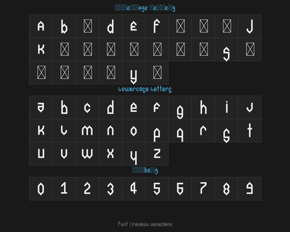 veneziano is a font file with a size of 0.02 MB. The full font name is Veneziano, Version 1.002;Fontself Maker 3.5.7 version. It contains 103 characters, supports 8 Chinese characters. The copyright belongs to Veneziano. veneziano font is available for free download, but commercial use requires confirmation on the Veneziano official website whether it's free for commercial use.