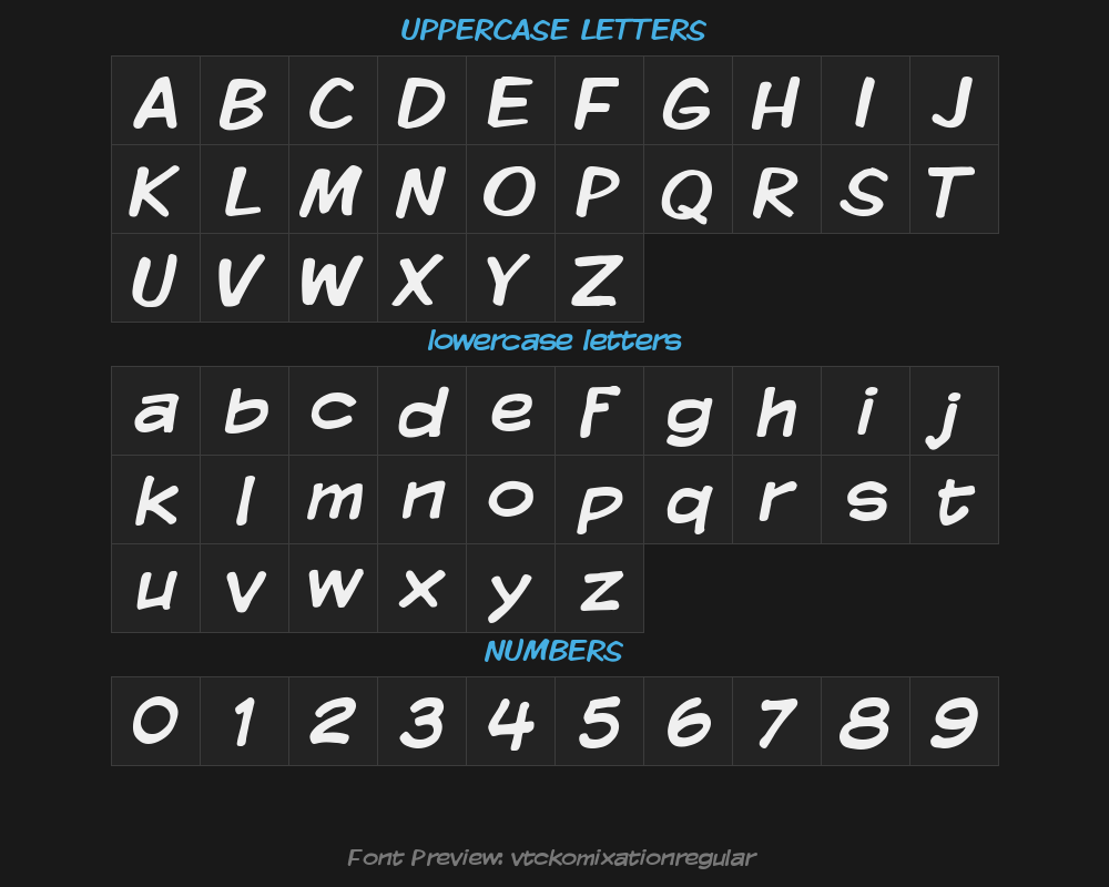 vtckomixationregular is a font file with a size of 0.04 MB. The full font name is VTCKomixationRegular, 1999; 1.0, initial release version. It contains 116 characters, supports 8 Chinese characters. The copyright belongs to VTCKomixationRegular. vtckomixationregular font is available for free download, but commercial use requires confirmation on the VTCKomixationRegular official website whether it's free for commercial use.