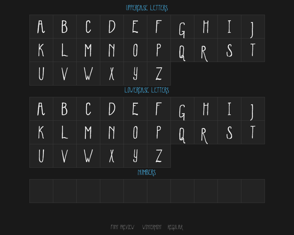 wintermint-regular is a font file with a size of 0.13 MB. The full font name is WinterMint-Regular, Version 1.000;PS 001.001;hotconv 1.0.56 version. It contains 91 characters, supports 8 Chinese characters. The copyright belongs to Winter Mint. wintermint-regular font is available for free download, but commercial use requires confirmation on the Winter Mint official website whether it's free for commercial use.