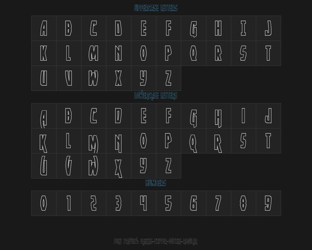 yankee-clipper-outline-regular is a font file with a size of 0.08 MB. The full font name is Yankee Clipper Outline Regular, 001.000 version. It contains 216 characters, supports 8 Chinese characters. The copyright belongs to Yankee Clipper Outline. yankee-clipper-outline-regular font is available for free download, but commercial use requires confirmation on the Yankee Clipper Outline official website whether it's free for commercial use.